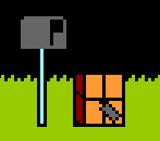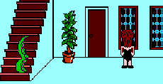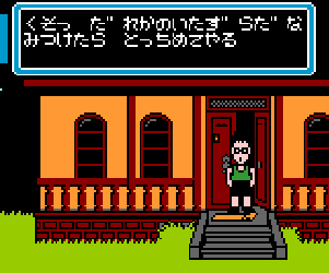 屋敷の外をとおる道路からものがたりが始まる。 画面左端へ移動すると庭に出る。 これは…墓地…? ※ちなみにプレイヤーのうち誰かが死ぬと、ここにお墓が立てられる(「まぬけちゃんのおはか」と書かれる)。クリアに必要なアイテムを持ったプレイヤーが死んでしまうと、何をどうしようと絶対にクリアできないので注意。  |
