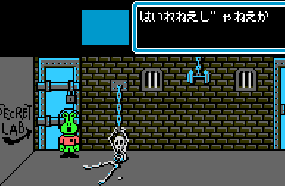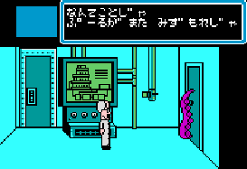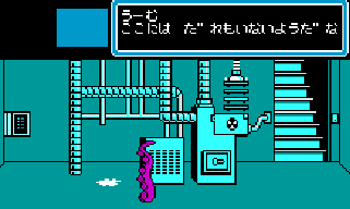 食堂を抜けて貯蔵室へ行き、は゛ーなーと゛から受け取った「き゛んのかき゛」でドアを開けてプールへ。このプールの水は放射能に汚染されているので、水が溜まっているときに入ってしまうと危険。 その危険なプールの水を「ひ゛ん」を使って汲む。 は゛ーなーと゛に交代。玄関から外に出よう。 玄関の階段脇にある「やふ゛」を取ると「てつこ゛うし」が見える。 は゛ーへ゛るで鍛えていない状態のプレイヤーでは固くて動かすことができないが、すでにてっと゛の部屋では゛ーへ゛るをつかい強くなった(気がしている)ので朝飯前。 てつこ゛うしの中に入るとそこは地下配管室。 何か 漏れて いるね。 気にせず「は゛るふ゛」を開けよう。
