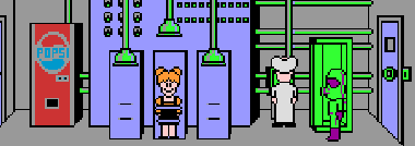 右にあるロッカーを開けて「ほ゛うこ゛ふく」を取って着用し、右のドアで「かーと゛きー」を使って乗り込もう。その部屋にある注射器マークのスイッチを押すとDr.ふれっと゛は正気に戻る。
