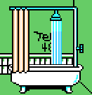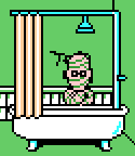 「しゃわーかーてん」を開けると中にはミイラが。何か文字が見えるが、このままでは読めないので、「か゛れーし゛」で取ってきた「し゛ゃく゛ちのとって」をつけて「しゃわー」を流そう。ミイラが流れたのを確認してから「しゃわー」をとめると番号が読める。